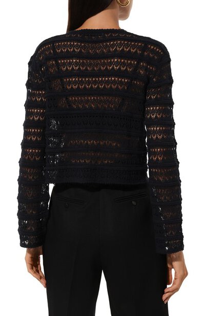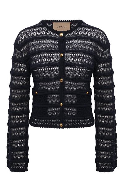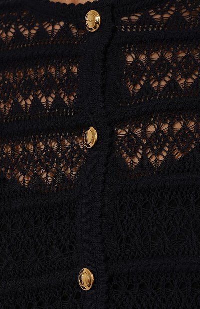 Укороченный ажурный кардиган прямого кроя связали из тонкой хлопковой пряжи. Манжеты и круглый вырез обрамили фестончатым кантом. Акценты расставили золотистыми пуговицами на планке и боковых карманах.
