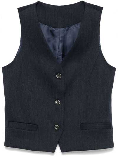 prussian blue wool twill weave front button fastening V-neck sleeveless dart detailing two front jetted pockets logo patch to the rear full lining straight hem