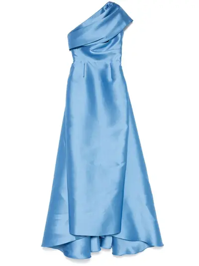 cornflower blue satin finish concealed side hook and zip fastening one-shoulder sleeveless draped detailing gathered detailing fitted waistline demi-train rear slit full lining straight hem full-length