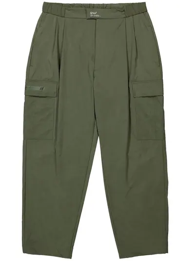 olive green recycled nylon ripstop texture concealed front fastening elasticated waistband logo print to the front pleat detailing multiple cargo pockets logo patch to the rear tapered leg