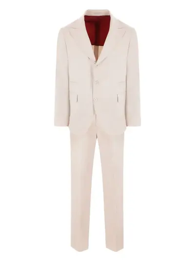 beige cotton-cashmere blend Jacket: front button fastening peak lapels long sleeves buttoned cuffs two side welt pockets two side flap pockets straight hem Trousers: concealed front fastening belt loops pleat detailing pressed crease two rear flap pockets slim cut