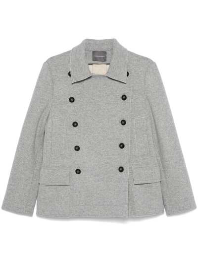 light grey wool blend textured finish double-breasted button fastening spread collar long sleeves two side welt pockets two side flap pockets straight hem