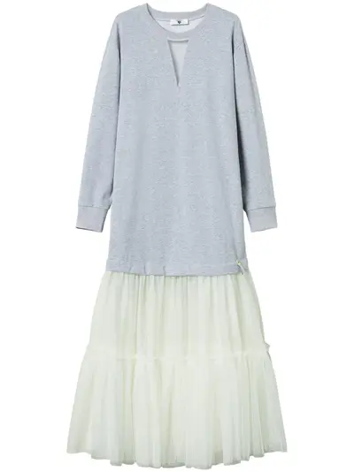 light blue/white cotton mélange effect layered design slip-on style crew neck cut-out detailing long sleeves ribbed cuffs mini logo tag full skirt straight hem ankle-length