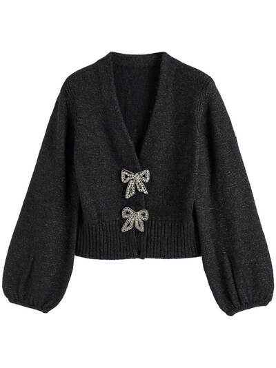 black knitted construction metallic threading brooch detail bow detailing concealed front fastening V-neck long sleeves elasticated cuffs ribbed hem