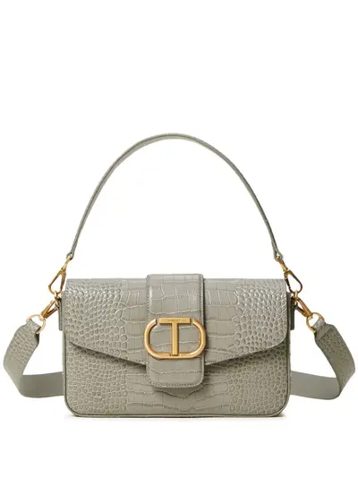 grey calf leather embossed crocodile effect foldover top with magnetic fastening single detachable top handle detachable shoulder strap gold-tone logo plaque main compartment internal zip-fastening pocket