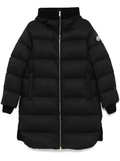 black goose down padded design front two-way zip fastening classic hood with ribbed trim logo patch at the sleeve long sleeves with ribbed cuffs full lining curved hem with knit panelling mid-length