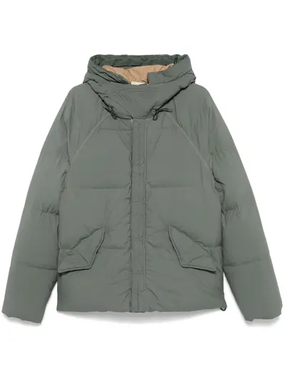 moss green down-feather filling shell padded design quilted water-repellent front press-stud and zip fastening drawstring hood stand-up collar long raglan sleeves elasticated cuffs two front flap pockets internal patch pocket cotton lining drawstring hem