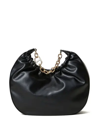 black faux leather gathered detailing magnetic fastening single chain-link top handle gold-tone logo plaque main compartment internal zip-fastening pocket