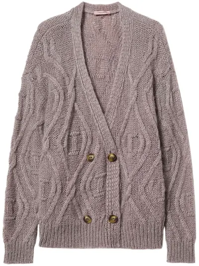 taupe brown mohair blend cable knit double-breasted button fastening V-neck drop shoulder long sleeves ribbed cuffs and hem