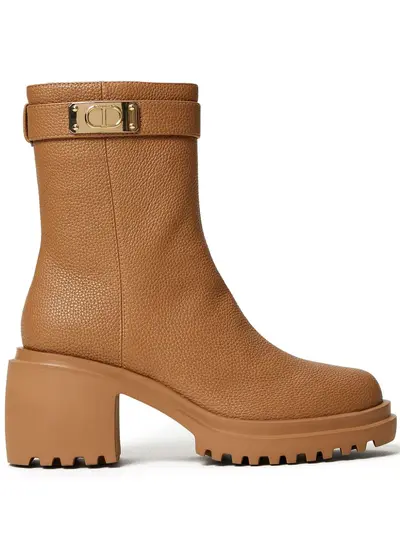 camel brown sheepskin pebbled texture gold-tone logo plaque ankle-length side zip fastening 70mm block heel gold-tone hardware round toe branded insole chunky rubber lug sole