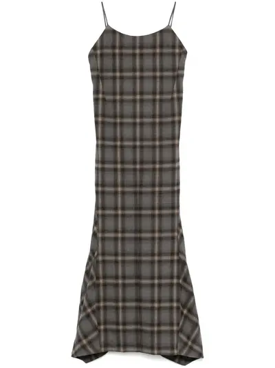 sepia brown cotton flannel check pattern rear tie fastening round neck sleeveless flared skirt curved hem long length