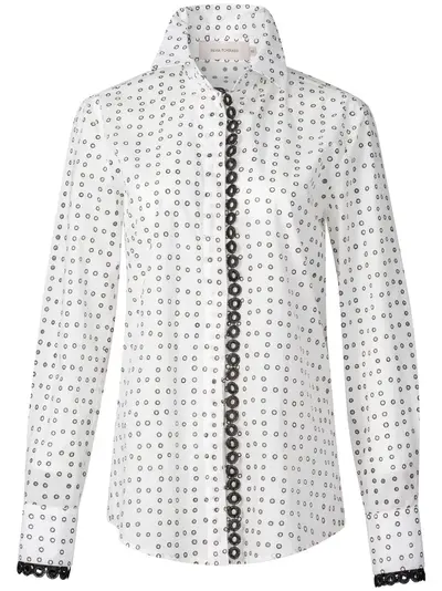 white/black cotton front button fastening polka dot print classic collar long sleeves curved hem