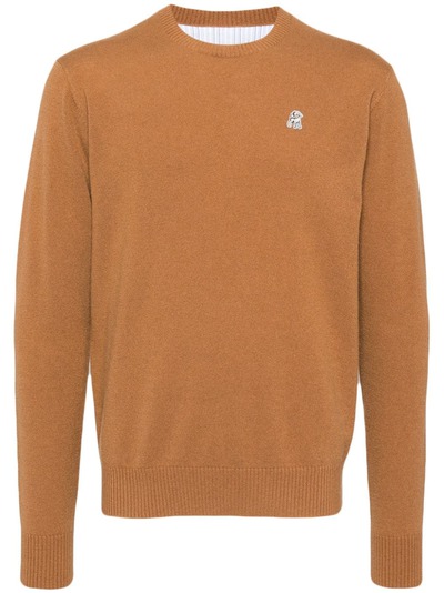 camel brown cashmere knitted construction embroidered sheep patch at chest ribbed band collar ribbed cuffs and hem