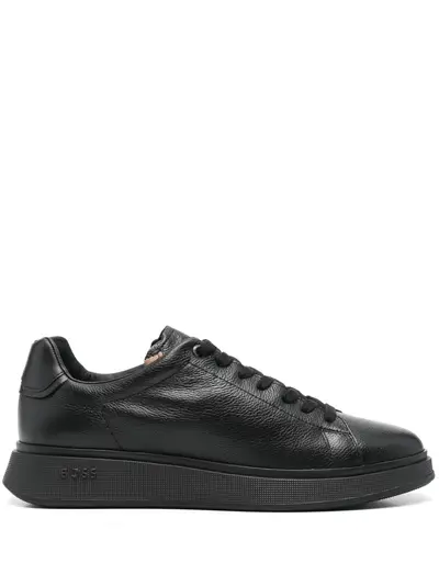 black calf leather grained texture polished effect front lace-up fastening branded heel counter mini logo tag to the tongue round toe padded ankle branded leather insole logo at the sole flat rubber sole