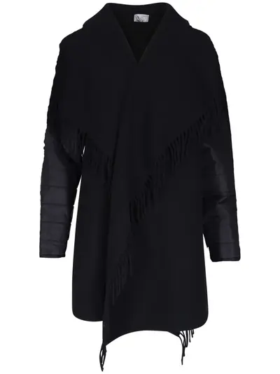 black wool blend fringe detailing shawl lapels long sleeves straight hem