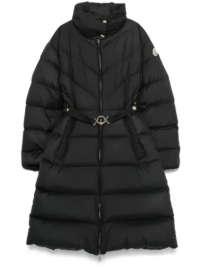 black down-feather filling quilted padded design front two-way zip fastening press-stud fastening high neck long sleeves logo patch at the sleeve elasticated cuffs belted waist two press-stud fastening side pockets rear elasticated waistband quilted lining straight hem mid-length authenticity QR code