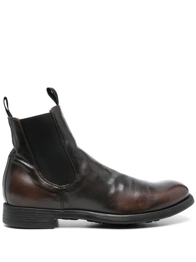 dark brown calf leather smooth grain distressed effect pull-on style low stacked heel ankle-length double pull-tab at the opening elasticated side panels round toe branded leather insole rubber sole