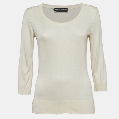This comfortable light beige jumper from Dolce and Gabbana will remain a wardrobe staple, complementing jeans to tailored pants. It has a knit construction with a round neckline and long sleeves.