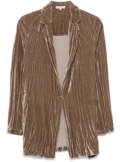taupe velvet plissé effect front button fastening notched lapels long sleeves two side slit pockets Italian rear vents unlined straight hem