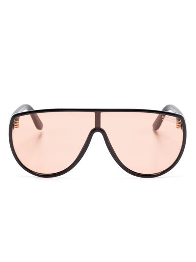 black acetate high-shine finish shield frame orange tinted lenses UV-protective lenses lens decal signature T-shaped hinge detail straight arms logo plaque curved tips These glasses come with a protective case.