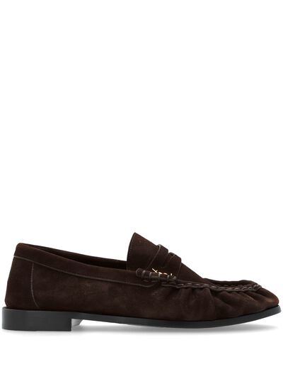 cedar brown calf suede slip-on style signature Cassandre logo plaque penny slot round toe branded leather insole leather sole