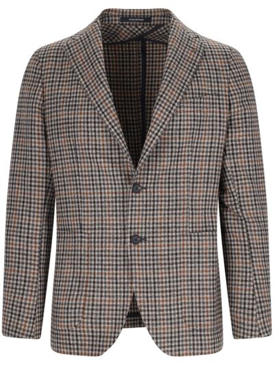 light brown virgin wool front button fastening puppytooth pattern notched lapels long sleeves buttoned cuffs chest welt pocket two side patch pockets central rear vent partial lining curved hem
