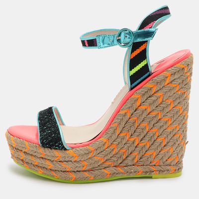 Youll love walking in these vibrant Lucita sandals from Sophia Webster that are perfect for your fashionable outings. These multicolor sandals are crafted from fabric and leather and feature an open toe silhouette. They flaunt single vamp straps and buckled ankle straps. They come equipped with comfortable leather lined insoles and 15cm espadrille wedge heels. Pair them with a knee length dress and a sling bag to make heads turn.