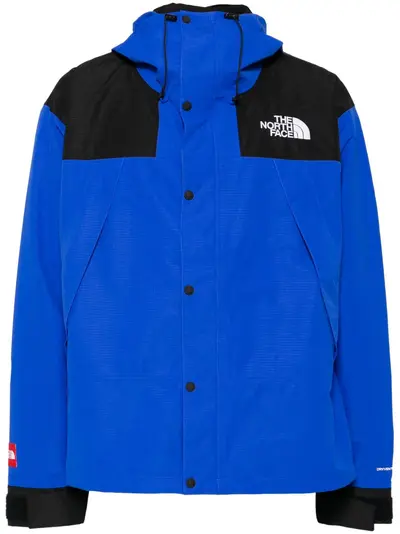 black/blue front press-stud and zip fastening panelled design drawstring hood embroidered logo at the chest two side zip-fastening pockets long sleeves magnetic-fastening cuff