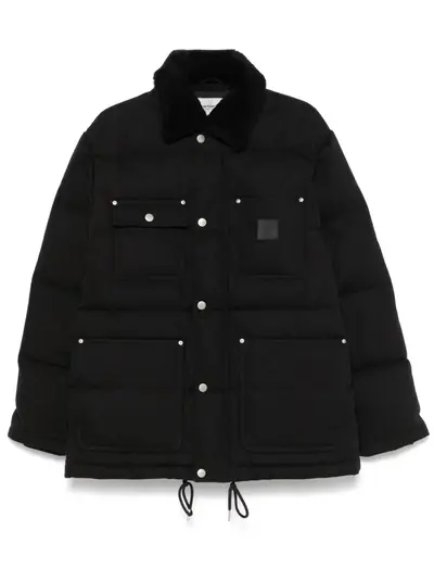 black cotton textured finish quilted front press-stud fastening concealed front zip fastening padded design faux-fur collar long sleeves ribbed cuffs chest flap pocket chest patch pocket logo patch at the chest two side patch pockets drawstring hem