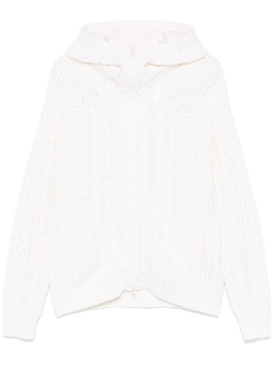 white wool blend chunky cable knit front two-way zip fastening slouchy hood long sleeves two side inset pockets embroidered logo to the rear straight hem authenticity QR code C.P. Company suggests removing any detachable accessories before washing.