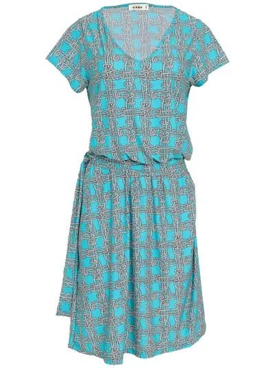 teal blue belted waist all-over graphic print V-neck short sleeves straight hem