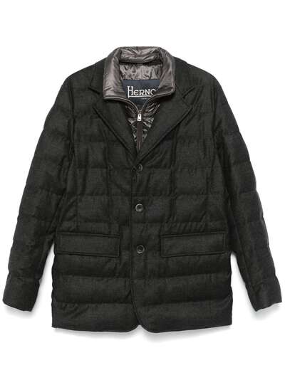 anthracite grey virgin wool-cashmere blend padded design goose down-feather filling layered design check pattern front button fastening front zip fastening detachable inner layer stand-up collar notched lapels long sleeves two front flap pockets internal zip-fastening pocket full lining straight hem