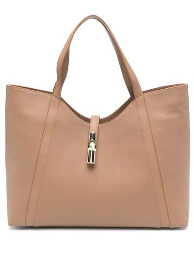 sand beige leather pebbled texture logo-buckle fastening two flat shoulder straps main compartment internal logo patch internal zip-fastening pocket internal patch pockets full lining