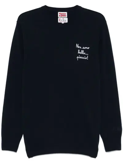 navy blue knitted construction crew neck embroidered slogan at the chest long sleeves embroidered logo at the sleeve ribbed cuffs and hem straight hem