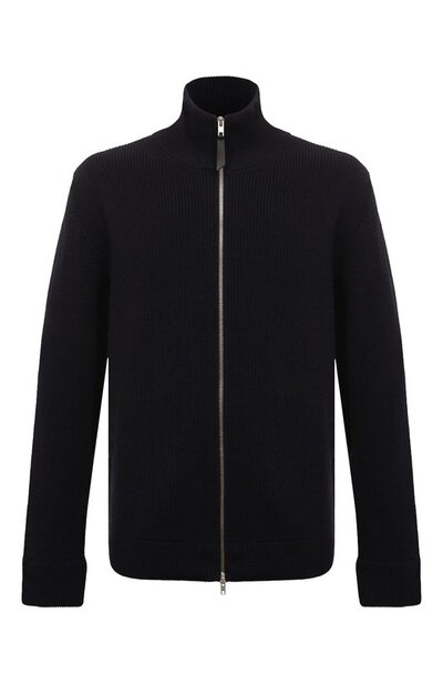 Кардиган с высоким воротом связали эластичным узором из хлопковой пряжи, утепленной шерстью. Модель, которая застегивается встречной молнией с кожаным пуллером, украсили сзади фирменными белыми стежками.