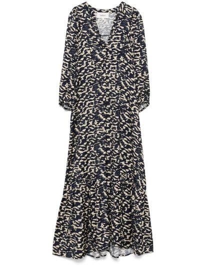 midnight blue/ecru twill weave short front button fastening abstract pattern print round split neck three-quarter length raglan sleeves elasticated cuffs bib panel contrasting trim gathered detailing ruffle hem mid-length