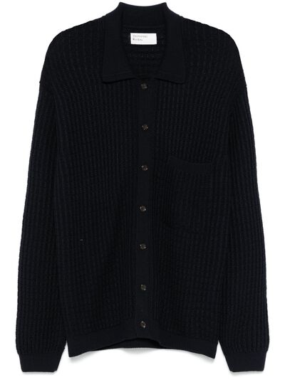 navy blue merino wool blend waffle knit ribbed panelling classic collar front button placket drop shoulder long sleeves chest patch pocket ribbed cuffs and hem