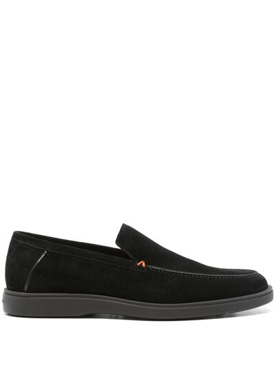 black calf suede slip-on style moc stitching almond toe branded leather insole flat rubber sole