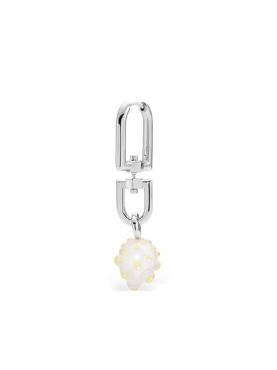 white rhodium plated recycled sterling silver polished finish pearl pendant lever fastening This is a single earring. Pearls should be the last thing that you put on in the morning and the first thing you take off at night. Avoid contact with perfumes or creams, and simply wipe with a soft cloth to clean.