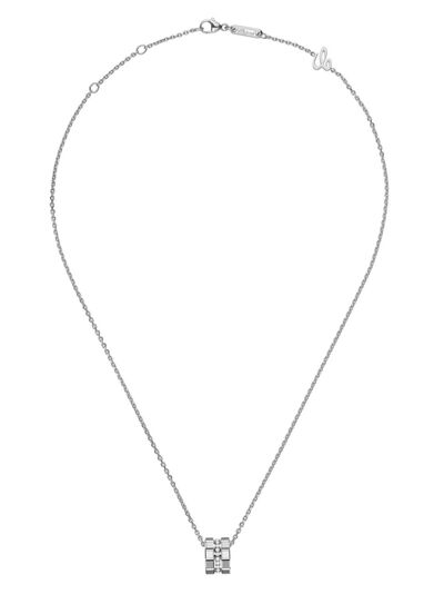 18kt white gold brushed finish popcorn chain circular pendant channel-set round cut white diamonds totalling 0.14ct logo plaque lobster claw fastening Normal everyday use and external agents may reduce the lustre of gemstones and gold surfaces. To maintain, use specific, non-abrasive products specially meant for cleaning jewellery.