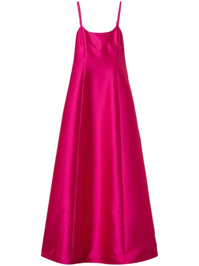 pink twill weave satin finish rear zip fastening adjustable spaghetti straps scoop neck rear elasticated waistband flared full lining floor-length