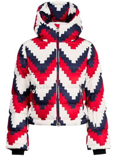 white/navy blue/red down-feather filling padded design quilted water-repellent front two-way zip fastening chevron print high neck classic hood branded zip puller long sleeves flared cuffs sleeve zip pocket front zip fastening pockets full lining adjustable snow skirt straight hem