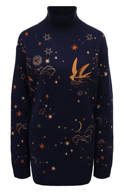 Удлиненный свитер с заниженной линией плеча выполнен из тонкой шерстяной пряжи с добавлением кашемира. Сзади под высоким воротником расположена брендированная пластина. Модель со всех сторон украшена авторской вышивкой.