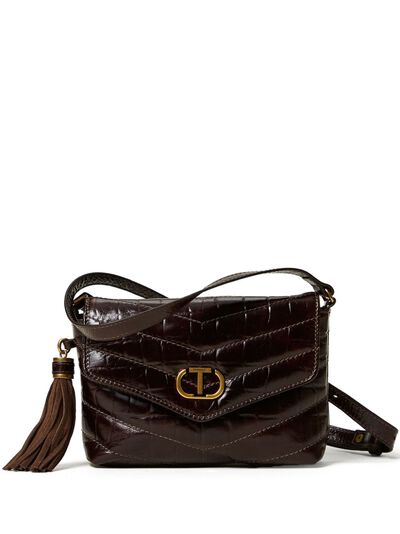 chocolate brown calf leather patent finish embossed crocodile effect foldover top with magnetic fastening adjustable shoulder strap tassel detail gold-tone logo plaque partitioned compartment internal zip-fastening pocket internal card slot