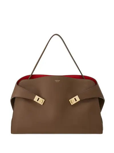 brown calf leather smooth grain open top detachable shoulder strap logo stamp to the front Gancini flip-lock fastening partitioned compartment contrast lining internal card slots internal zip-fastening pocket