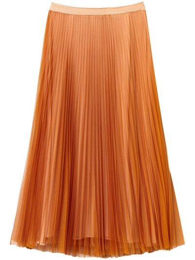 sunset orange tulle overlay fully pleated appliqué logo high-waisted side zip fastening straight hem