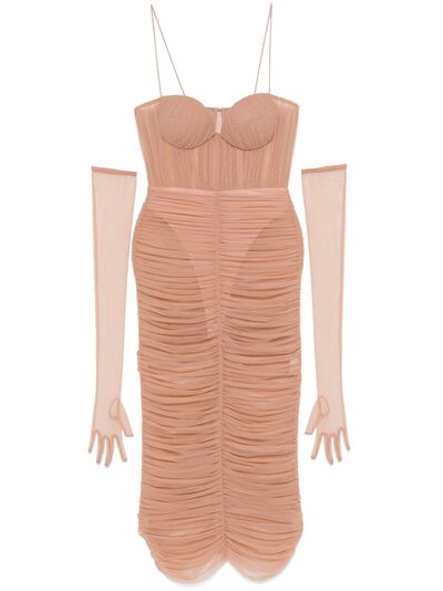 powder pink stretch-mesh design ruched semi-sheer construction concealed rear hook and zip fastening spaghetti straps sweetheart neck boned bodice detachable off-shoulder glove sleeves fitted waistline unlined curved hem mid-length