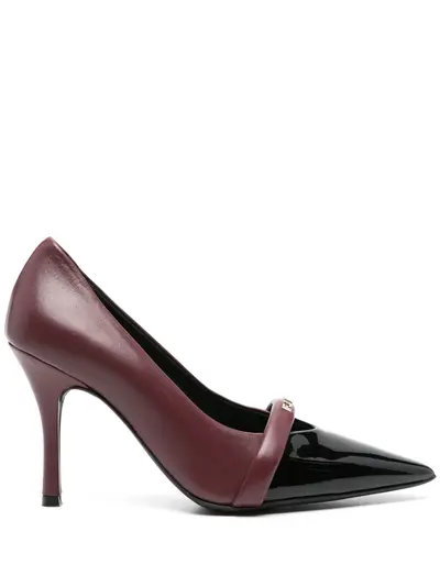 dark purple/black leather panelled design patent finish panel pointed toe front cut-out detailing front gold-tone logo lettering branded leather insole 90mm high stiletto heel rubber outsole slip-on style This piece comes complete with a protective dust bag.