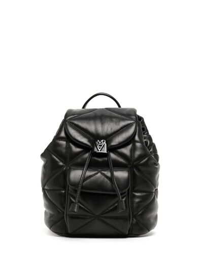 black leather diamond-quilted detailing logo patch to the front single top handle front flap pocket adjustable shoulder straps main compartment