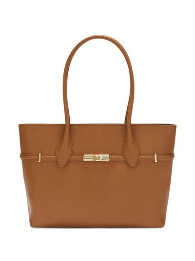 camel brown leather top zip fastening two long top handles logo print to the rear main compartment internal logo patch internal zip-fastening pocket
